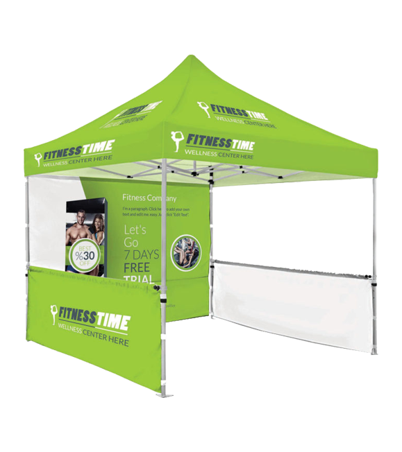 IMPRINT: Full color, full coverage dye sublimation on all 4 sides of peak and valance, one side of the full rear wall and one side on each of the 2 half side walls.